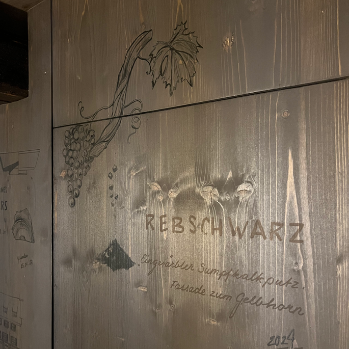 Was einst war und was aus der Bauforschung sowie Archäologie am Gelbhorn hervorgegangen ist, wird in den Toiletten des Restaurants, die sich im ehemaligen Bereich der offenen Küche im 1.OG befinden, auf kunstvoll russgeschwärzten Holzeinbauten in wissenschaftlichen Zeichnungen sichtbar gemacht.